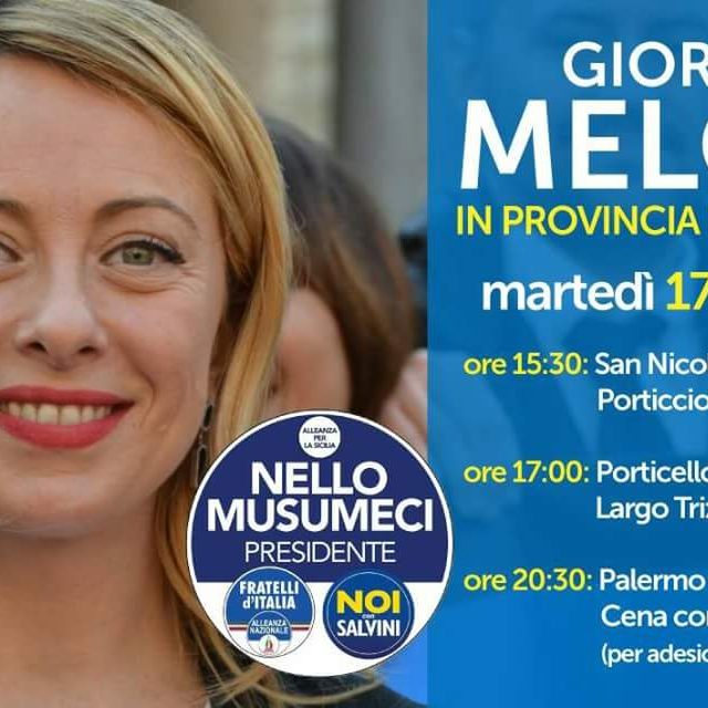 Continua il tour di Giorgia Meloni in Sicilia per sostenere Nello Musumeci e la lista “Musumeci Presidente” . Questa mattina la leader di Fratelli d’Italia,…